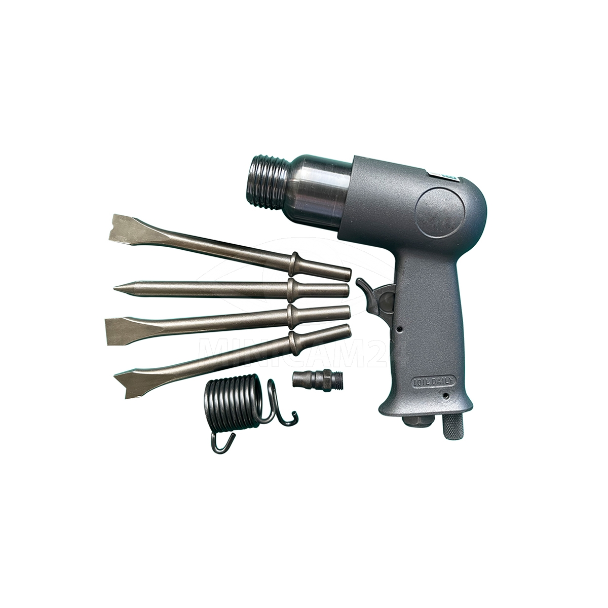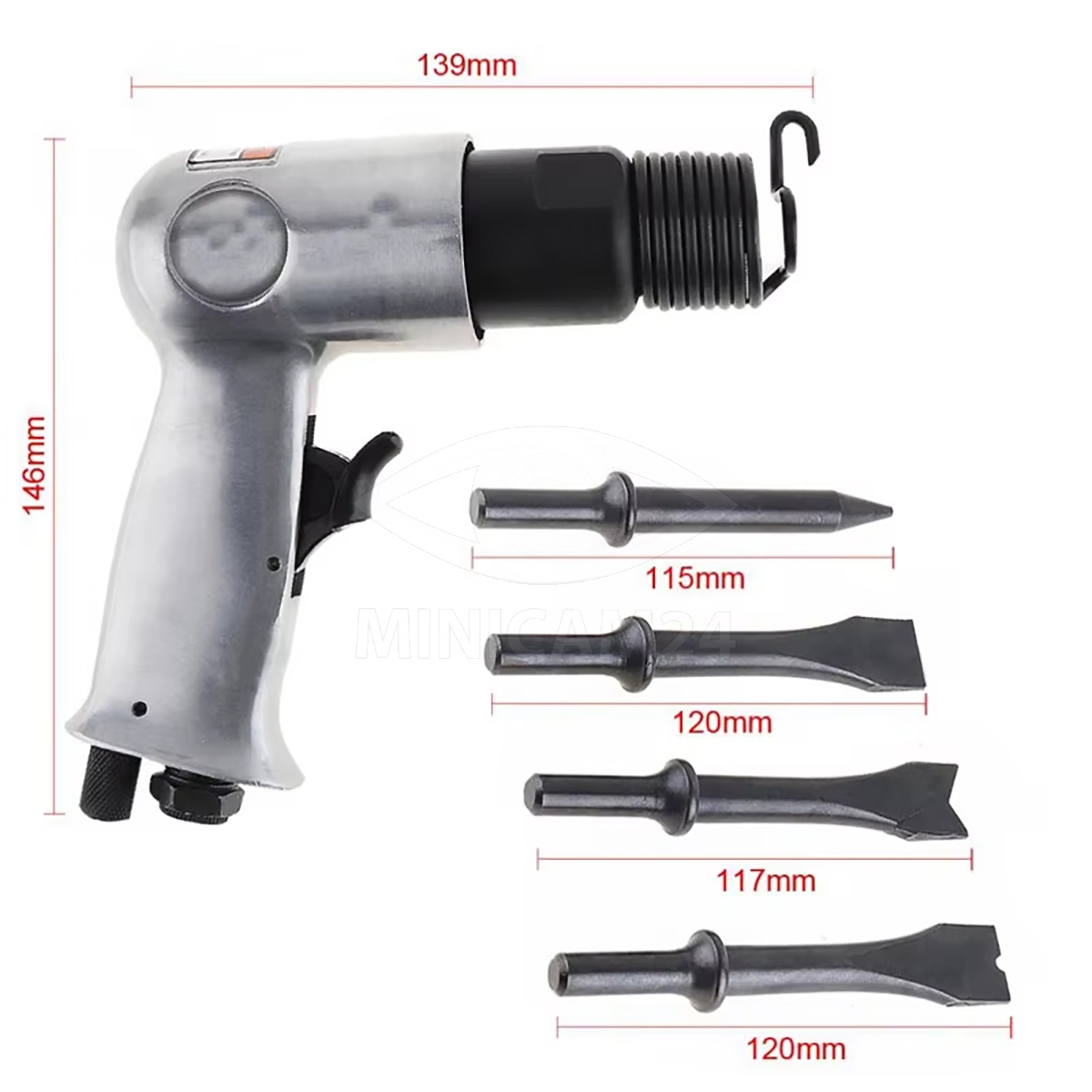 Молоток имеет расход воздуха 114 л/мин и ход цилиндра 150 мм, что позволяет добиться высокой производительности и точности. В комплект входят сам инструмент, 4 насадки, впускное отверстие и пружина, что делает его готовым к использованию сразу после покупки.